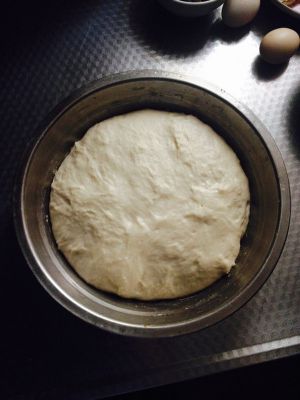 用温水把糖化开,加入酵母搅匀,后加入高筋面粉揉成面团,等待20分钟左右,面团发酵至两倍大