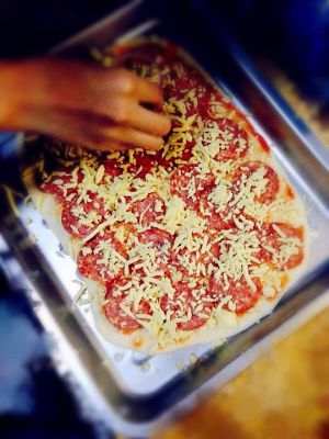 在饼上先刷一层披萨酱(番茄酱),再撒一层马苏里拉芝士碎,摆上萨拉米香肠后再撒一层芝士