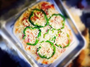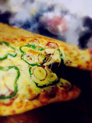 码上彩椒和洋葱(可根据个人口味选择食材),够再撒一层马苏里拉芝士碎