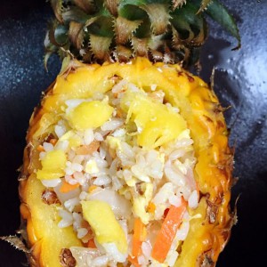锅放油,烧热后,鸡蛋倒进去,七成熟,加洋葱和虾仁,然后放胡萝卜,再把米饭和菠萝肉放进去,少许的盐。洋葱提味,菠萝本身酸甜可口,所以仅少许的盐就够啦,这道菜本身的风味很不错,不用放鸡精,酱油blabla的哦~还原食物本色