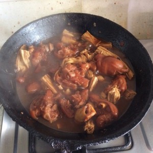 在还有15分钟炖完时,将腐竹切段,放入锅中,