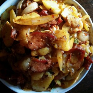 把炸好的土豆倒入锅底部用炒好的菜盖住,在用小火煎一下,轻轻翻动,就可以装盘了。