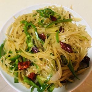土豆先切片,后切丝,厚度适中就行,别太厚也别太薄,如图参考即可,切记新手不要着急,小心别切到手。