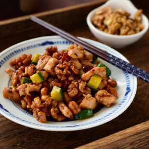 下入鸡丁翻炒半分钟,再下入黄瓜丁和炝香的干红椒段翻炒片刻