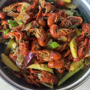 喜欢汤多的可以保留汤汁,不喜欢汤的可以大火收汁,收汁前倒入炸好的土豆条黄瓜条或其他蔬菜,然后装盘。啦啦啦,美味的麻辣小龙虾出锅啦