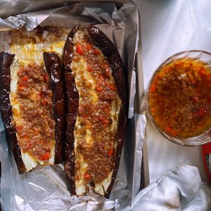 茄子烤好了拿出来用小刀剖开摊平,浇上蒜蓉辣椒酱再放烤箱烤19分钟即可
