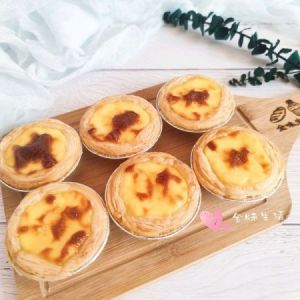 将蛋挞液均匀倒入蛋挞皮中至9分满。