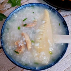 粥里加入鸡腿肉,春笋,一点点盐,一点点猪油,一点白胡椒粉。