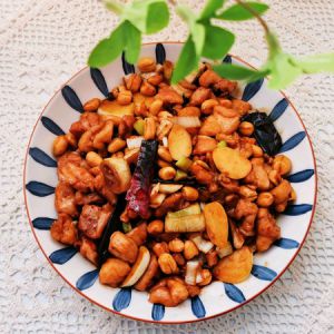 鸡腿剔骨去皮去油和筋膜,用牙签扎几下,切成稍大的丁。花生米开水浸泡10分钟捞出控干水分去皮。大葱、姜、蒜切成片