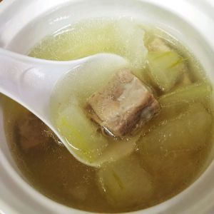 炖煮至排骨肉可以剥离排骨,即排骨煮熟后,约一个半小时,加入冬瓜片炖煮。
