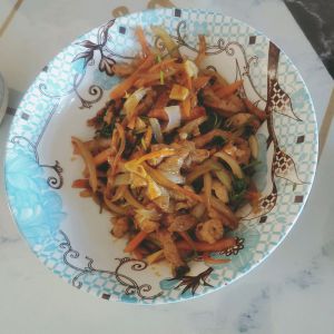 买一袋鱼香肉丝调味料,然后把食材准备好,炒熟之后,放上这个料,翻炒均匀。