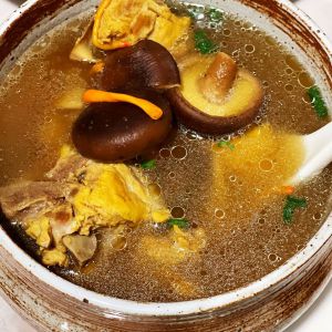 排骨冷水下锅,放入切好的香菇、虫草花,放姜片和少许枸杞就可以煲汤了。