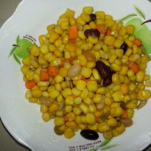 蜜豆(超市袋装的),瓜子仁(超市盒装)各少许,我取的量少,因为只爱吃玉米粒,呵呵
