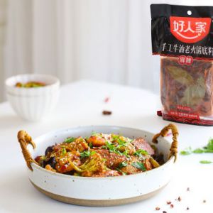 另起一锅,锅中倒入15克菜籽油,加入好人家手工牛油老火锅底料20克、1勺郫县豆瓣酱
