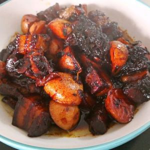 待汤汁收了一半,肉肉软烂时,入土豆,一起煨。如果水不够了,加一点热水,防止土豆扒锅