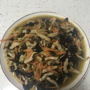 放入胡萝卜、木耳、香菜翻炒与肉混合均匀