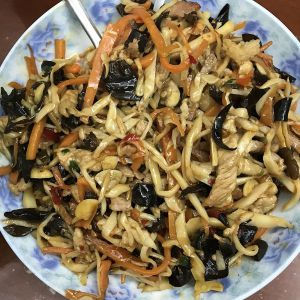 杏鲍菇洗净切丝后放入盐拌匀腌制会,挤出水分备用,胡萝卜切丝,木耳泡发洗净切丝,猪肉洗净切丝,葱切末,蒜切末,备用