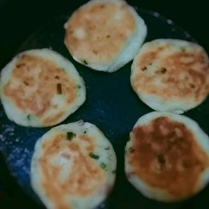 平底锅热油,把加工后的土豆泥揉捏成小圆饼,放入锅内煎至两面金黄即可。