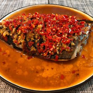 在腌制好的鱼头上面均匀的撒上料酒、生抽和醋,一勺豆瓣酱均匀的涂抹在鱼头表面,把炒香的葱姜蒜末也均匀的铺在鱼头上,撒一丢丢盐,撒适量胡椒粉和鸡精,并且把剩下的红椒铺在鱼头上,上蒸锅蒸十五到二十分钟