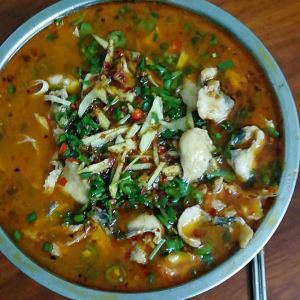 接着把腌着的鱼片倒入锅中,用筷子轻轻拨散(不能一直翻,这样鱼片易碎,吃的时候夹不起来,可以轻轻晃动一下锅),尝一下鱼汤调味(喜欢酸辣的朋友可以适量放点白醋)大火煮熟,把鱼片鱼汤一起倒入大盆中。