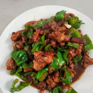 待汤汁浓稠时加少许鸡精翻炒均匀,再下青辣椒块和蒜片,翻炒均匀即可出锅。