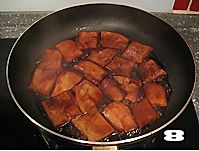 待杏鲍菇煎出少许水份后,倒入适量腌制的料汁。