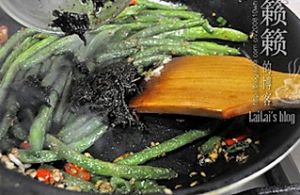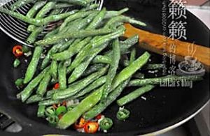 炒锅烧热,注入少许油,油温起来后下蒜末、姜末,青╱红尖椒圈,中小火煸香,倒入控油后的龙豆,先下精盐翻炒以保证豆角入盐味,再往锅中喷入料酒少许去异味增香味,依次添加糖少许,以及豉油1、头抽匙翻炒,酌情继续分次烹入料酒;