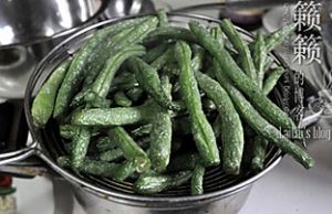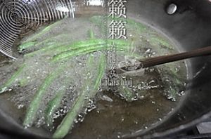 起油锅,六、七成左右油温时,下豆角油炸,注意炸的过程中将豆角用筷子拨动使其均匀受热;