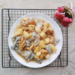 将鸡肉切成丁,加入生抽,麻油,淀粉,蚝油提前腌制15分钟;将苹果,火龙果去皮切成丁,百合洗净掰成片备用