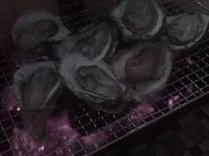 放在烤炉上烤生蚝,然后给整好的彊蒜金不换茸用热油淋加适量盐和酱油