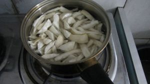 将杏鲍菇撕成条状,放入开水中,烫熟!