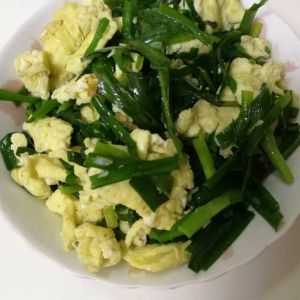 锅中放油放入大蒜,韭菜翻炒三分钟。