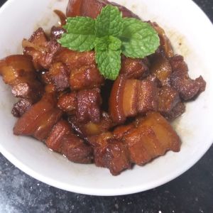 选用优质5层的好五花肉,焯水,炒出油后乘出,冷油下锅加冰糖炒融后下五花肉上糖色均匀,加入蘸油,加水烧至肉变软