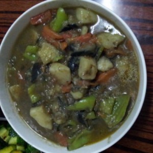 接着放入土豆茄子翻炒,然后加入适量的水。
