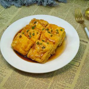 锅中热油,豆腐盒放入锅中小火慢慢炸至金黄色.