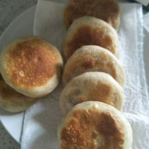 面团分成小挤子,擀成四周薄中间厚的圆片,放上馅料,像包包子一样包紧。