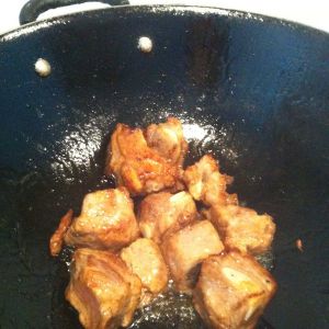 迅速倒入排骨翻炒至焦黄色,烹入少量生抽。