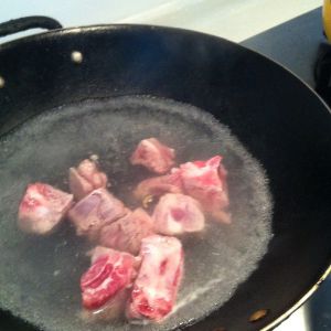 坐水烧开,放入适量料酒,将排骨焯一下,去掉腥味和血水。