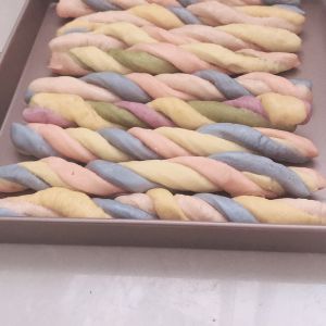 菠菜,胡萝卜分别榨汁,加入牛奶,面粉,糖,酵母和好,放在温暖处发酵