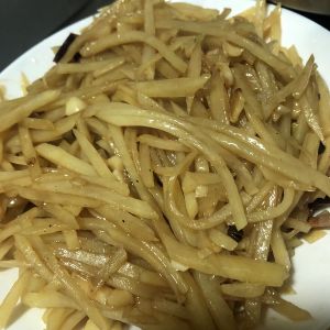 蒜切末 加入干红辣椒 麻椒 爆香 加入土豆丝翻炒 再加入耗油 酱油 少许醋