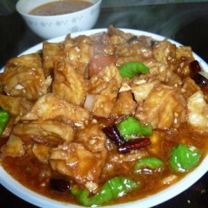 锅里放油,7分熟,放入茄子,炸制金黄色取出,装盘,备用。