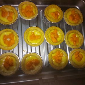 倒7分满入烤箱先烤15分钟后拿出加入芒果粒再烤35分钟左,提前180度上下火预熟,上下火230度