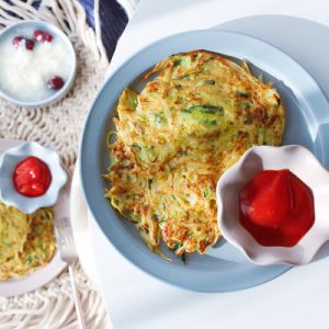 锅热加入少许油,舀一勺土豆丝嫩南瓜丝放入锅内。中火煎致底部变色。