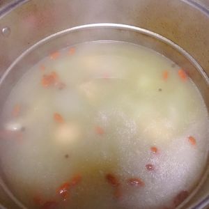 水开下排骨 莲子和百合 (枸杞最后在下 因为先下颜色会变的很红)改小火炖 这步忘记照相了 哈哈