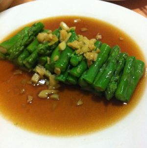 锅中放少量油爆香蒜末,加生抽和耗油一起炒匀,加一勺凉水,水开倒在芦笋上