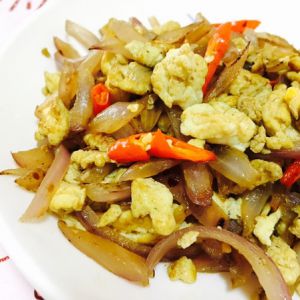 锅里热油 倒入洋葱和小米辣 加入盐 炒至洋葱透明变软
