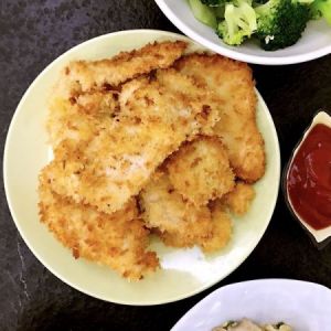 炸的时候到啦,腌好的材料用少许生粉抓一抓,这样肉质更加嫩滑,然后热油到7.8分后,拿取一片肉裹一层蛋液,裹一层面包糠,就可以下锅啦,两面金黄就大功告成了