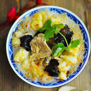将粉丝烫熟放入碗中,煮好的泡馍连同羊汤倒入大碗,上面放入黑木耳,牛羊肉切片,放置粉丝上,洒上切碎的青蒜香菜,按个人喜好浇入辣椒酱, 或搭配糖蒜吃即可。