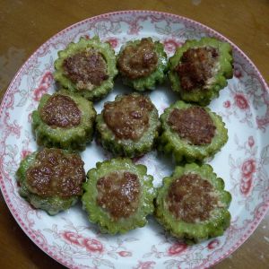 成品摆盘。(如果不想吃油炸的,把肉馅放进苦瓜里面,然后上锅蒸大火15分钟即可)