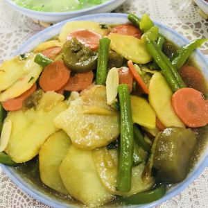 热锅冷油,炸土豆和茄子。因为我心急一下子全倒进去了所以有的炸透了有的没炸到。在这里我想提醒大家:炸茄子的时候油温尽量高一些,众所周知茄子很吃油,油温高的话会没那么吃油。但是炸完之后还是很油,什么油不油的废话这么多,想吃就别怕油啦哈哈哈